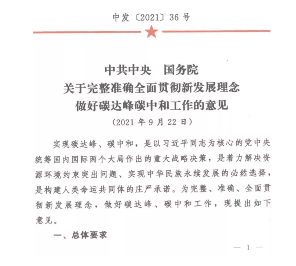 9月22日,中共中央下發(fā)《關(guān)于完整準(zhǔn)確全面貫徹新發(fā)展理念做好碳達(dá)峰碳中和工作的意見》。
