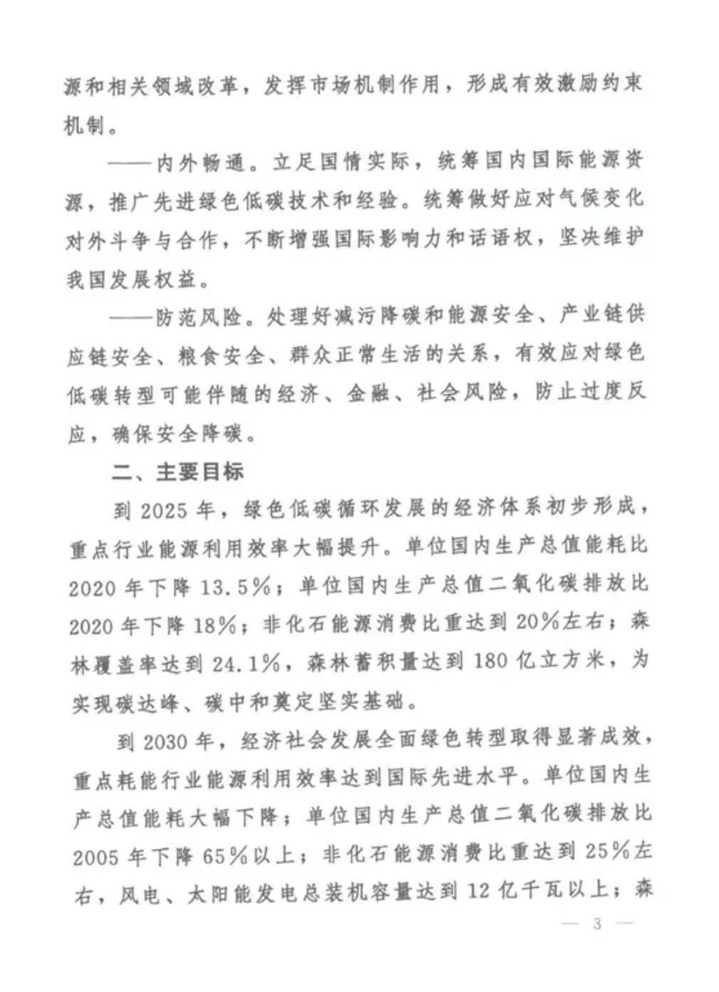 到2025年,單位國(guó)內(nèi)生產(chǎn)總值能耗比2020年下降13.5%;單位國(guó)內(nèi)生產(chǎn)總值二氧化碳排放比2020年下降18%;非化石能源消費(fèi)比重達(dá)到20%左右;森林覆蓋率達(dá)到24.1%,森林蓄積量達(dá)到180億立方米。