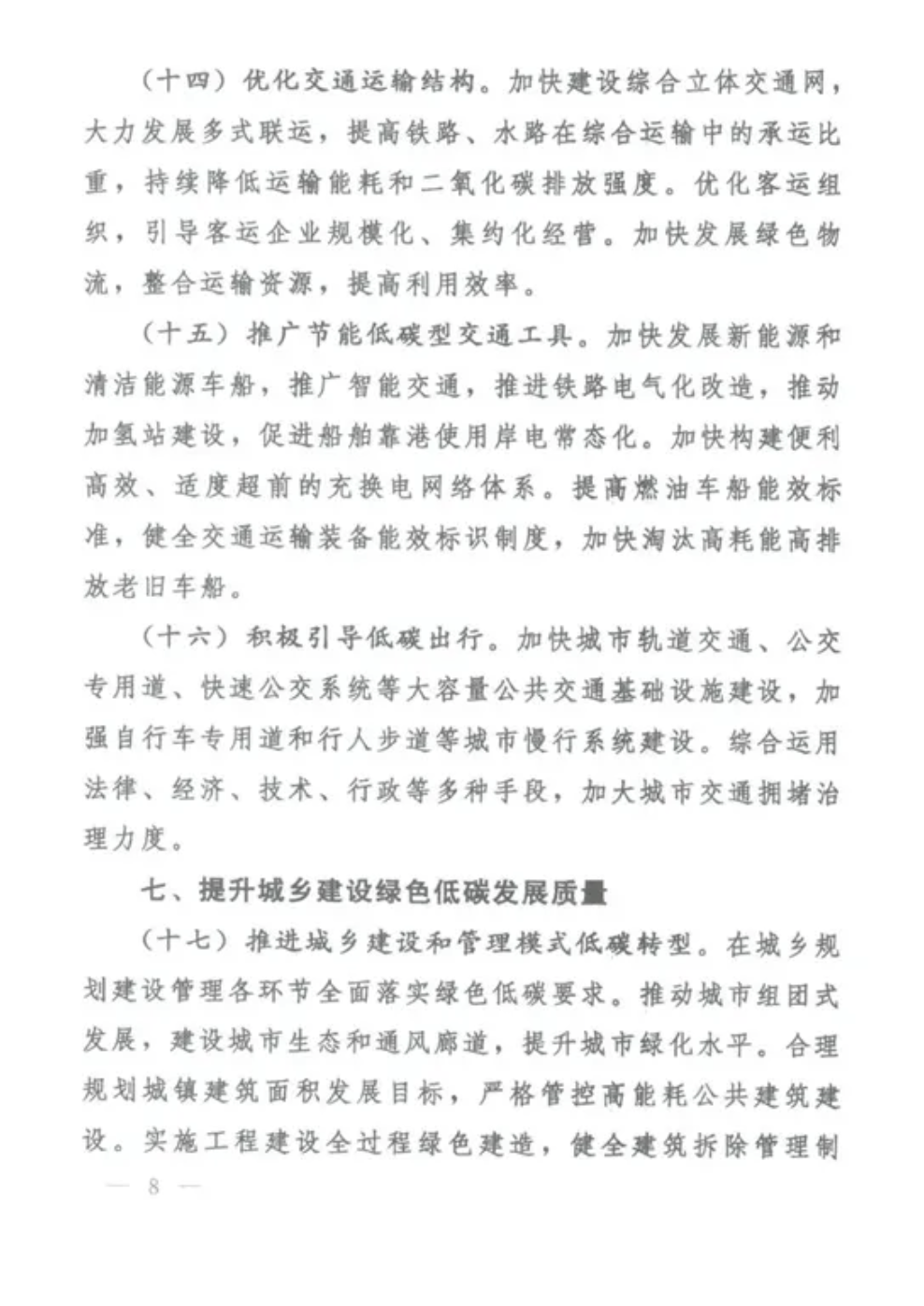 (十七)推進(jìn)城鄉(xiāng)建設(shè)和管理模式低碳轉(zhuǎn)型。在城鄉(xiāng)規(guī)劃建設(shè)管理各環(huán)節(jié)全面落實(shí)綠色低碳要求。推動(dòng)城市組團(tuán)式發(fā)展,建設(shè)城市生態(tài)和通風(fēng)廊道,提升城市綠化水平。合理規(guī)劃城鎮(zhèn)建筑面積發(fā)展目標(biāo),嚴(yán)格管控高能耗公共建筑建設(shè)。實(shí)施工程建設(shè)全過程綠色建造,健全建筑拆除管理制度,杜絕大拆大建。加快推進(jìn)綠色社區(qū)建設(shè)。結(jié)合實(shí)施鄉(xiāng)村建設(shè)行動(dòng),推進(jìn)縣城和農(nóng)村綠色低碳發(fā)展。